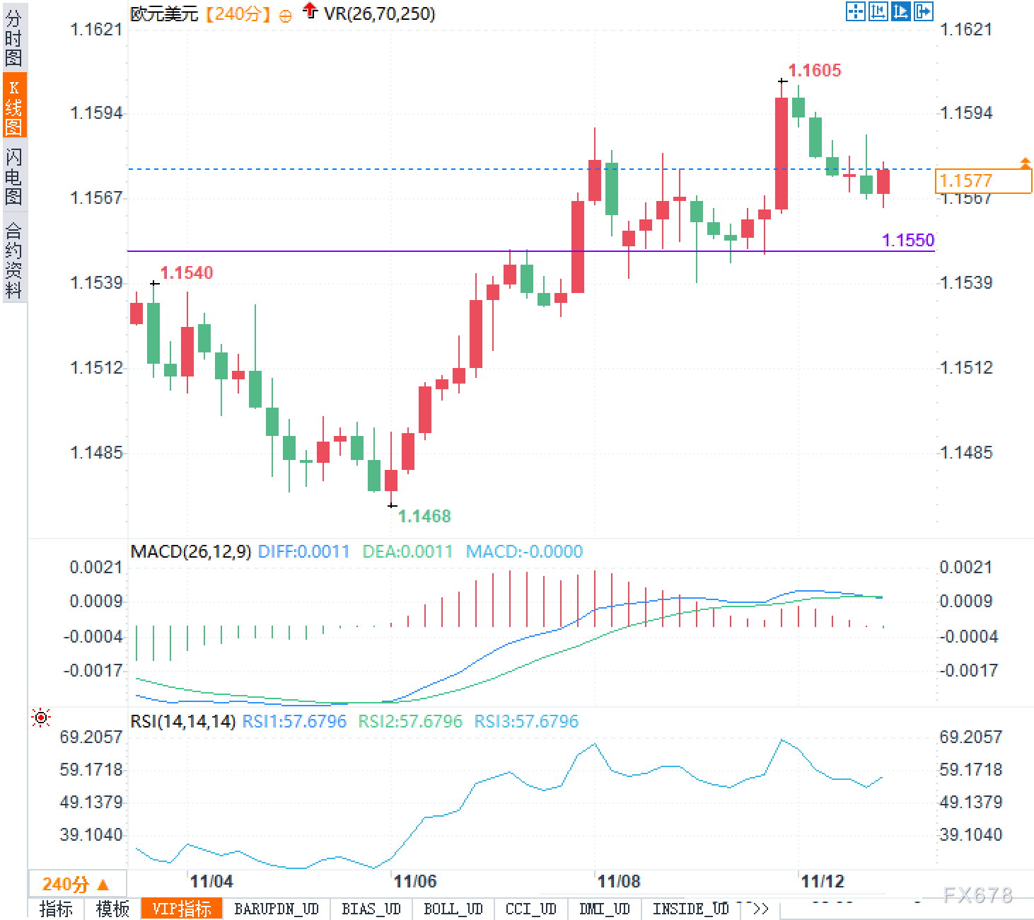 4小时图显示,欧元兑美元自1.1468展开的反弹结构仍在,低点与高点依次抬升。价格昨日在1.1605遇阻回落,现报1.1577,仍位于1.1550上方的密集成交与颈线区域。MACD保持在零轴上方但红柱缩短,动能边际走弱;